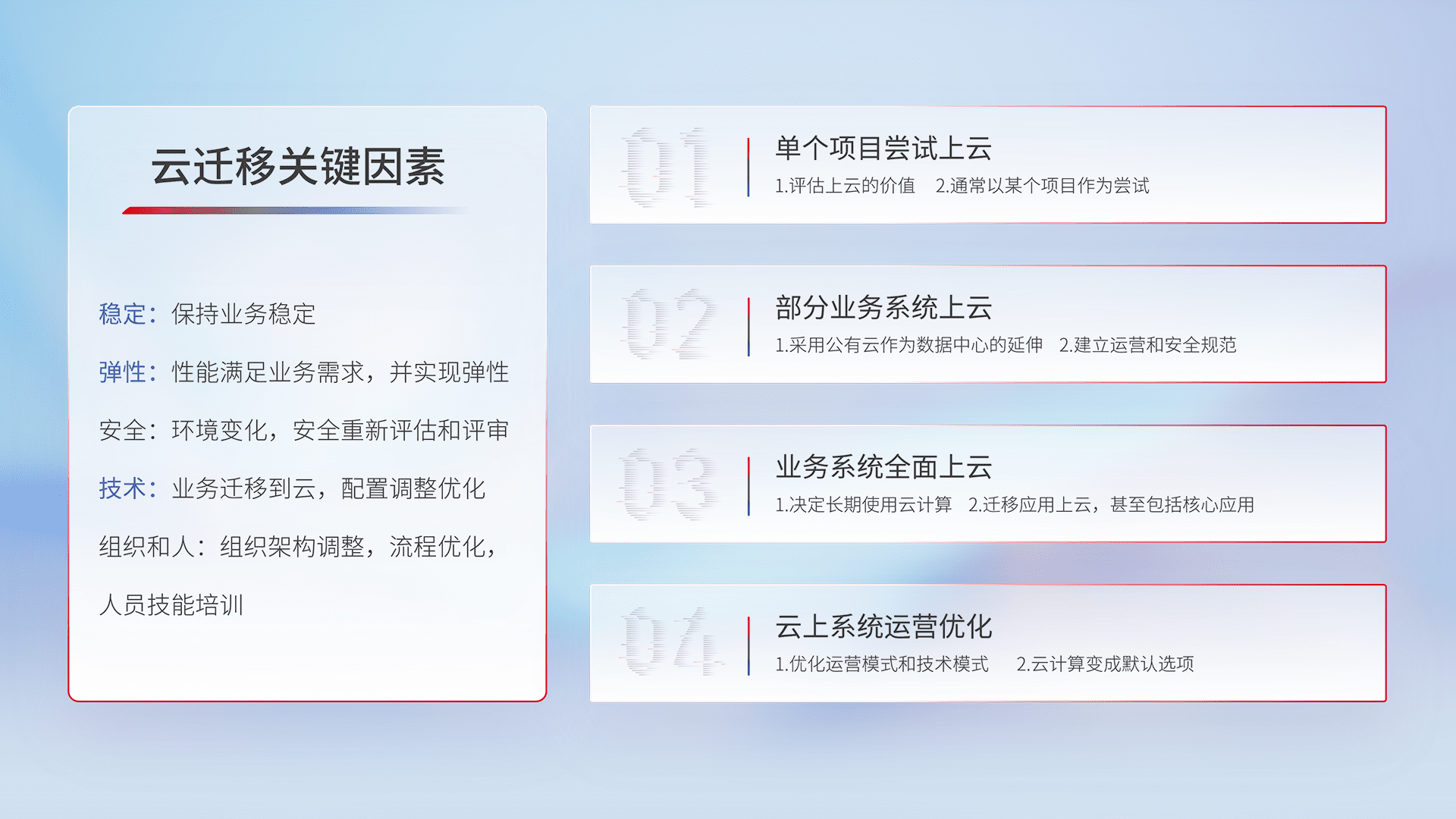 结合实际业务,,从规划设计、、、云平台选型、、、、云原生改造、、、数据迁移、、集成交付,,,迁移全过程为客户识别最佳上云路径,,,,做好风险识别管理,,,设计网络架构、、身份权限、、、安全审计合规、、操作审计、、、、日志审计、、、监控告警策略、、、多站点容灾设计等,,对云上基础设施进行整体规划,,,,提升IT治理水平,,以满足弹性、、高可用、、、、高性能的需求。。
