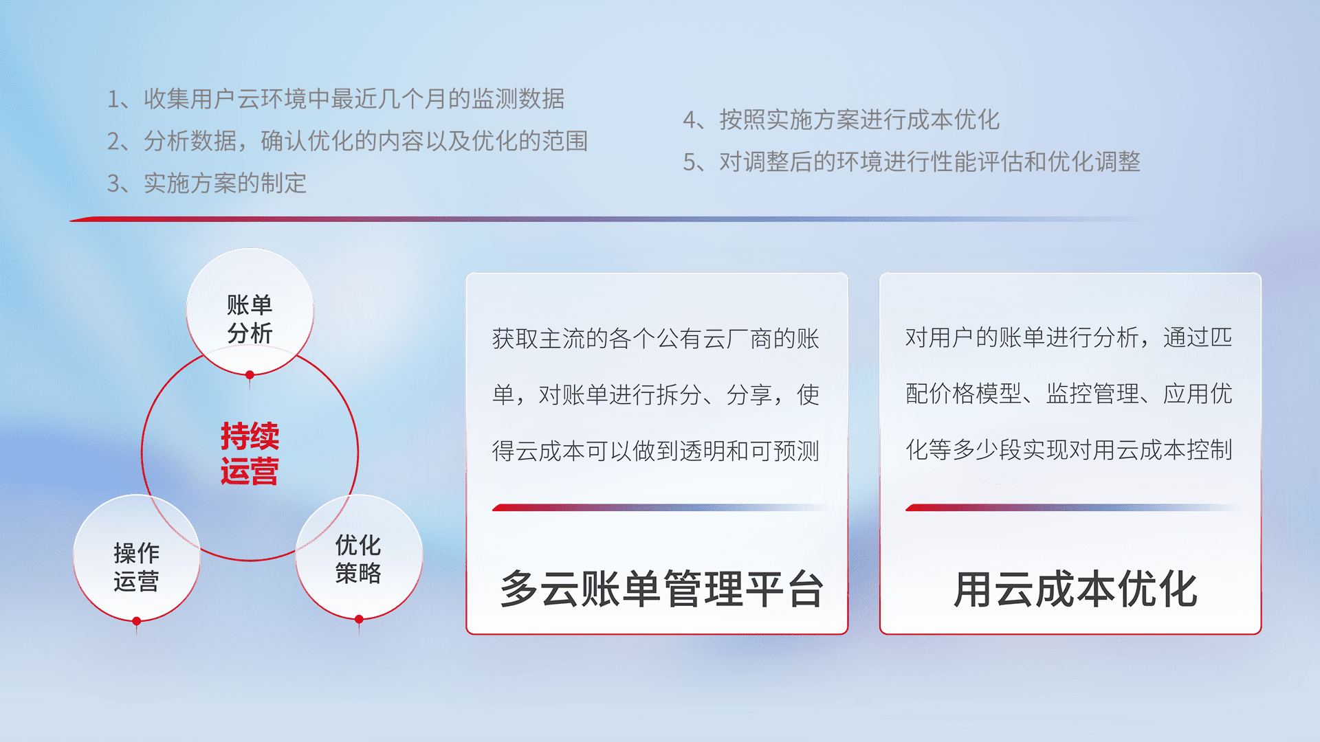 通过多云纳管,,以统一的资源数据模型把客户的云资源进行抽象和封装,,进而实现对多云资源的统一操作,,保障云资源管理的可靠性、、、稳定性与可用性。。。。量身定制化运维内容,,,配置、、、、开发运维、、补丁管理、、、、备份、、监控、、认证和访问管理、、、审计和日常巡检等,,,保障在用云过程中的可靠度,,,稳定度以及高可用率。。。